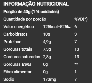Requeijão, queijos (minas artesanal e parmesão), polvilho doce, água, polvilho azedo, ovo integral pasteurizado, óleo vegetal, alho em pó, margarina, leite em pó, amido de mandioca modificado, alho triturado, sal light e cheiro verde.