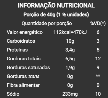 Queijos (ricota, minas artesanal e parmesão), água, azeitona, polvilho doce, polvilho azedo, ovo integral pasteurizado, óleo vegetal, amido de mandioca modificado, margarina, leite em pó, sal light e azeite de oliva.