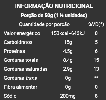 Queijos (minas artesanal, parmesão, tipo gouda e tipo emmental), água, polvilho doce, polvilho azedo, ovo integral pasteurizado, óleo vegetal, margarina, amido de mandioca modificado e sal light.