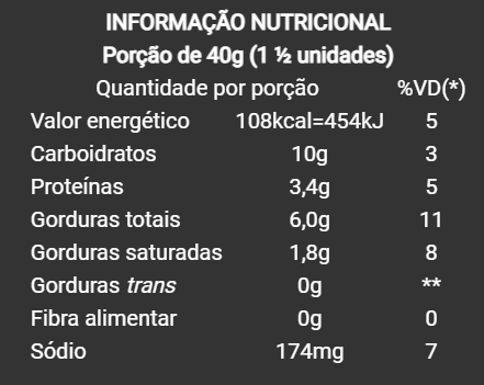Queijos (minas artesanal e parmesão), frango, água, polvilho doce, polvilho azedo, ovo integral pasteurizado, molho de tomate, óleo vegetal, margarina, amido de mandioca modificado, ketchup, leite em pó, sal light, molho inglês, vinho branco, açúcar mascavo, cebola em pó, orégano e alho em pó.