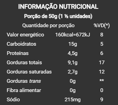 Queijos (minas artesanal e parmesão), água, polvilho doce, polvilho azedo, ovo integral pasteurizado, óleo vegetal, margarina, amido de mandioca modificado e sal light.